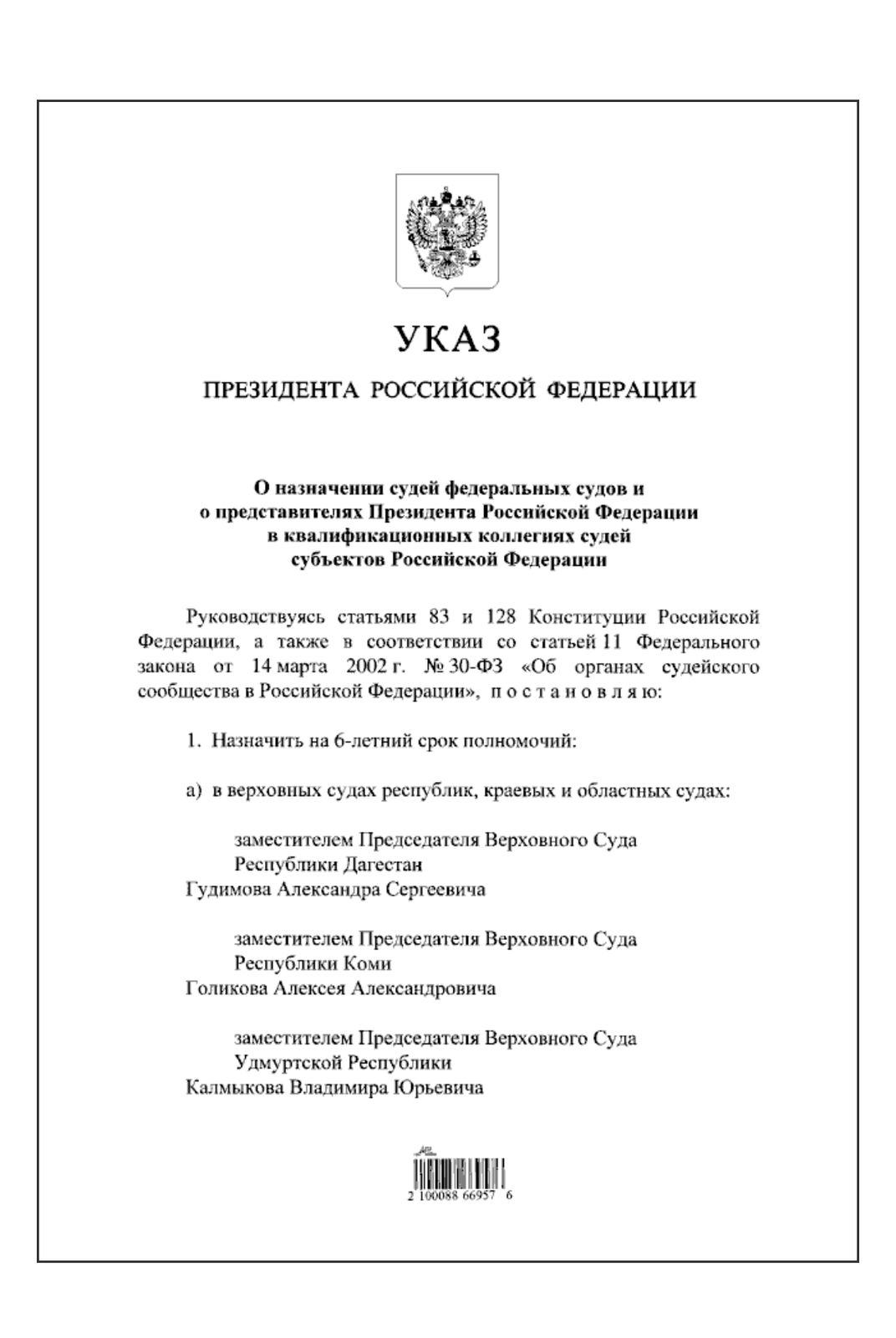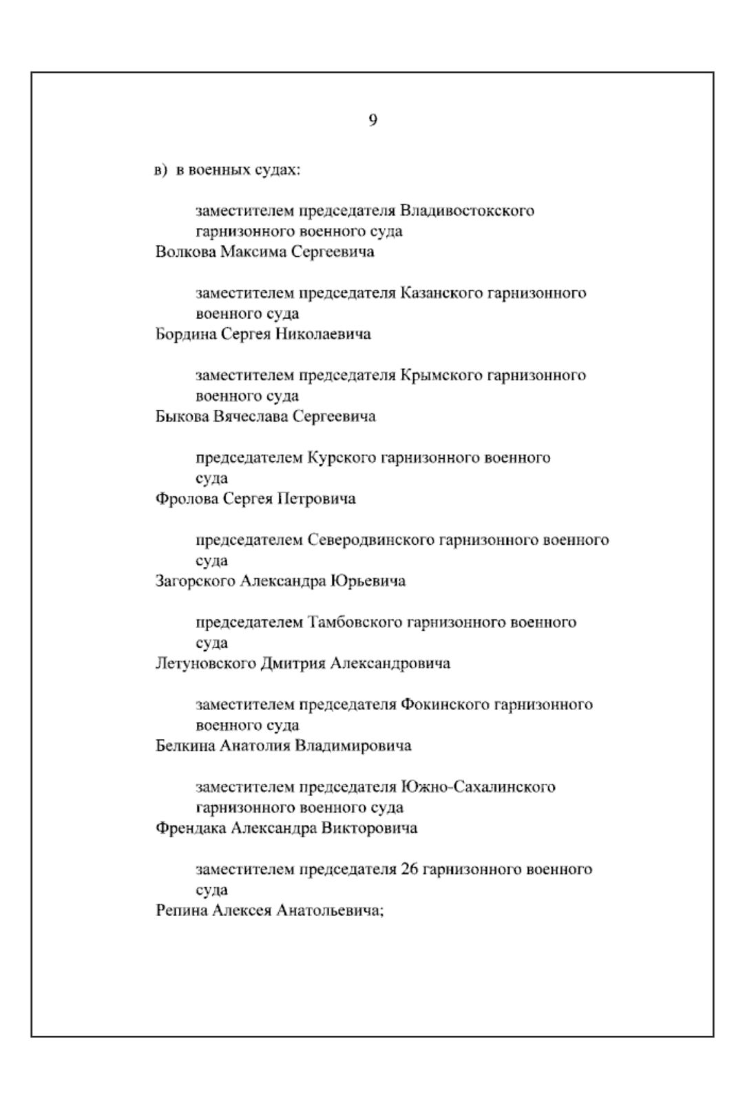 Указом Президента Российской Федерации от 6 октября 2025 года № 706 судья Белогорского гарнизонного военного суда Бордин Сергей Николаевич назначен заместителем председателя Казанского гарнизонного военного суда