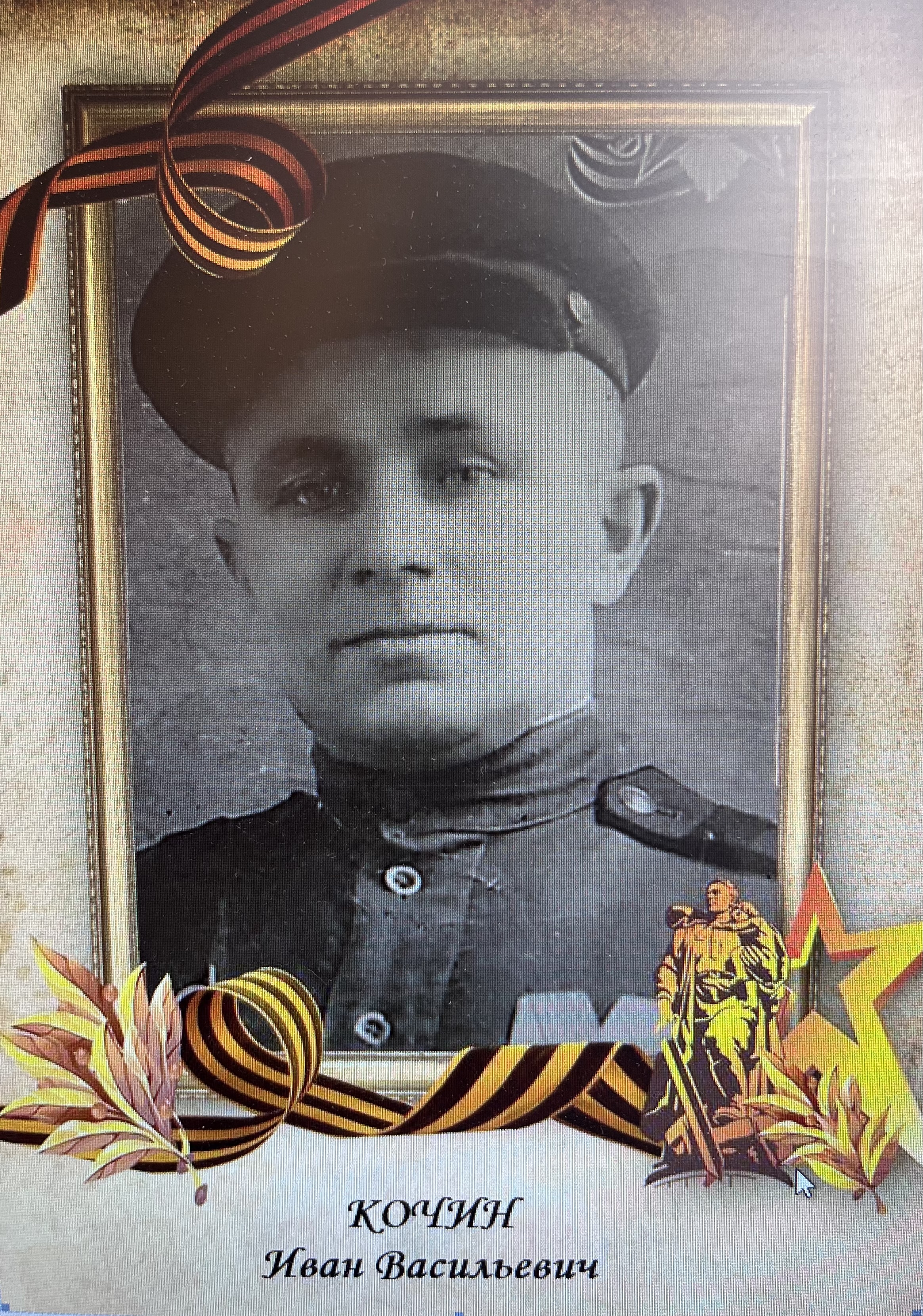 Кочин Иван Васильевич. Иван Васильевич 1905 года рождения, уроженец г. Бийска Алтайского края. 23 июня 1941 года Бийским ГВК Алтайского края призван в ряды Красной Армии. С первых дней Отечественной войны он участвовал в составе 710-го отдельного дорожно-эксплуатационного (батальона) полка РГХ Западного фронта в районе г. Ржева ст. Нелидово. С января по май 1942 года работал шофером в 386 автобате, в 17 автобригаде Ленинградского фронта на трассе Ладожское озеро г. Ленинграда по подвозу продовольствия и боеприпасов Ленинградскому фронту. Ежедневно перевыполнял норму выработки, вместо двух рейсов совершал три и без единой аварии. В феврале 1942 года во время налета вражеской авиации, бомба противника попала в кузов впереди идущей машины. Иван Васильевич проявив мужество и отвагу, первым, не смотря на обстрел противника начал гасить горящую машину с боеприпасами. Снаряды были сброшены с машины и полностью сохранены. 22 мая 1942 года, во время налета вражеской авиации на склад боеприпасов в деревне Шепелёво, Иван Васильевич со своим товарищем за 10 минут разгрузили 3-х тонные машины и вывели их из-под бомбежки, замаскировали склад боеприпасов. Кочин И.В. неоднократно попадал под артиллерийский обстрел и никогда не проявлял трусости, всегда выводил свою машину в полной сохранности. Во время боев за г. Белгород (июль - август 1943) подвозил боеприпасы на передний фронт. Иван Васильевич на своей машине приезжал 400 км в сутки и при этом сам нагружал и разгружал боеприпасы. Награжден медалью «За боевые заслуги» и Орденом